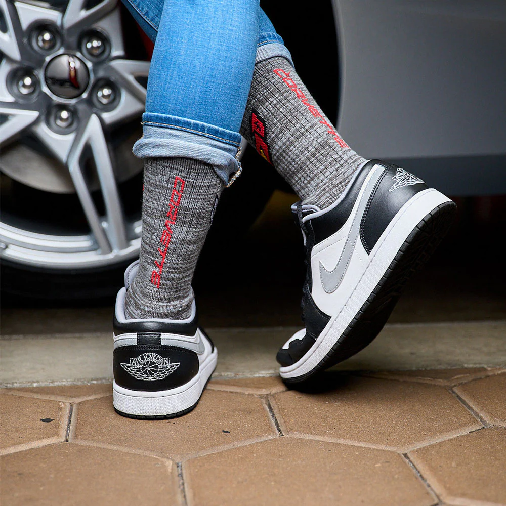 C8 Corvette Quad Crew Socks. Crew socks feature a C8 Corvette emblem with Corvette script on the back. 83% acrylic, 14% polyester, 2% spandex, 1% rubber.