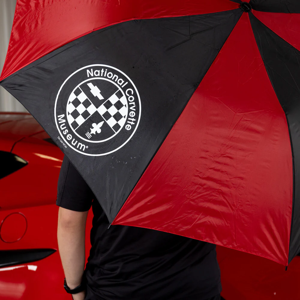 National Corvette Museum Logo Golf Umbrella. Stay dry with this oversized NCM Golf Umbrella. Comes in red and black and decorated with the National Corvette Museum logo. Features a wood handle with a strap. Has an approximate 49" diameter when open.